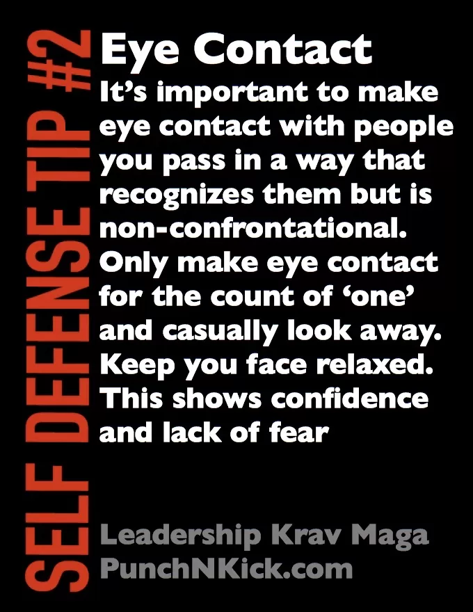 Avoiding eye contact is a sure way of ‘flagging’ yourself as a victim. Predators usually are not rocket scientist. But, something they do very well is picking out a victim. Communicate to the world around you that you are a confident and strong person by showing a ‘sence of purpose’ when you walk. Make eye contact briefly to show that you acknowledge someone’s precence but are not intimidated by them. Swing your arms as you walk (should not be burdened with possible ‘loot’ for the predator). Predators usually don’t have plan ‘B’. If when they ‘Vet’ you and you don’t appear to be a weak target, they move on to an alternate victim. That brief look may be the barrier that keeps you from being attacked.